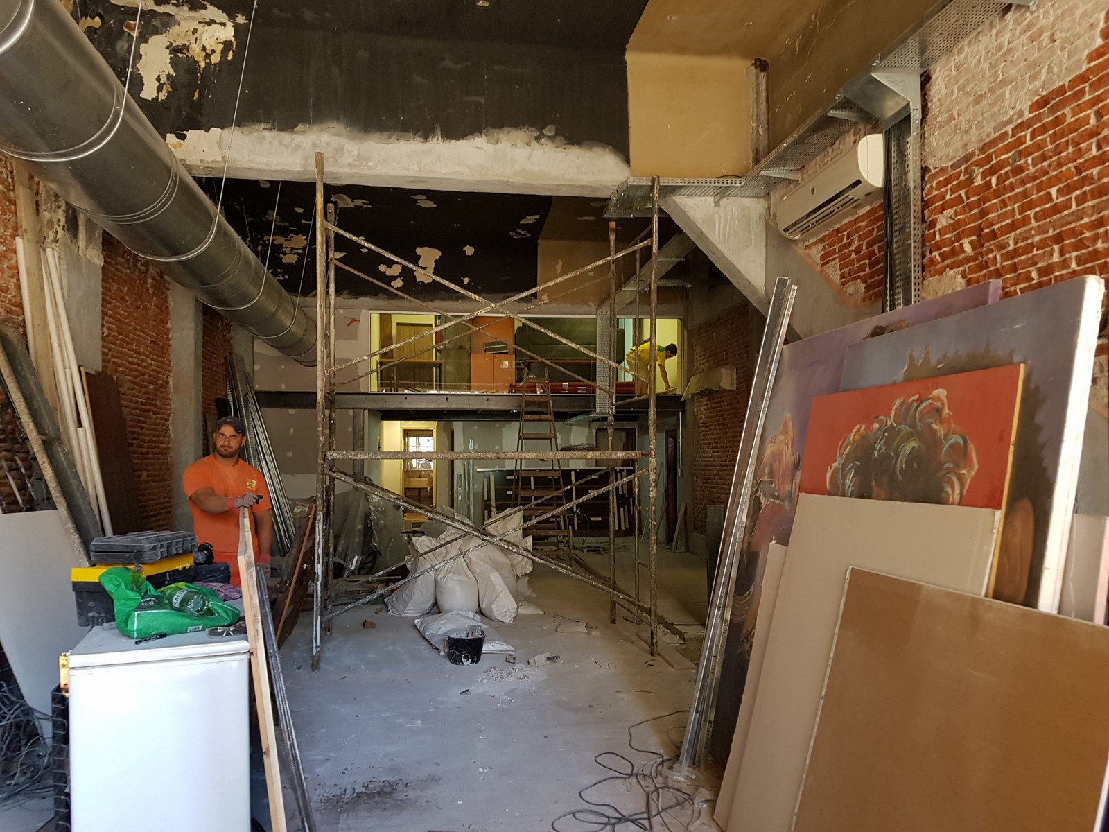Retiramos los cielorrasos de yeso, típico de una década para el olvido, por el despojo de un techo existente en color negro, aclimatando acústicamente con paneles acústicos, limitados por unas bandejas industriales que llevan la instalación eléctrica en contraste sutil con el ambiente.